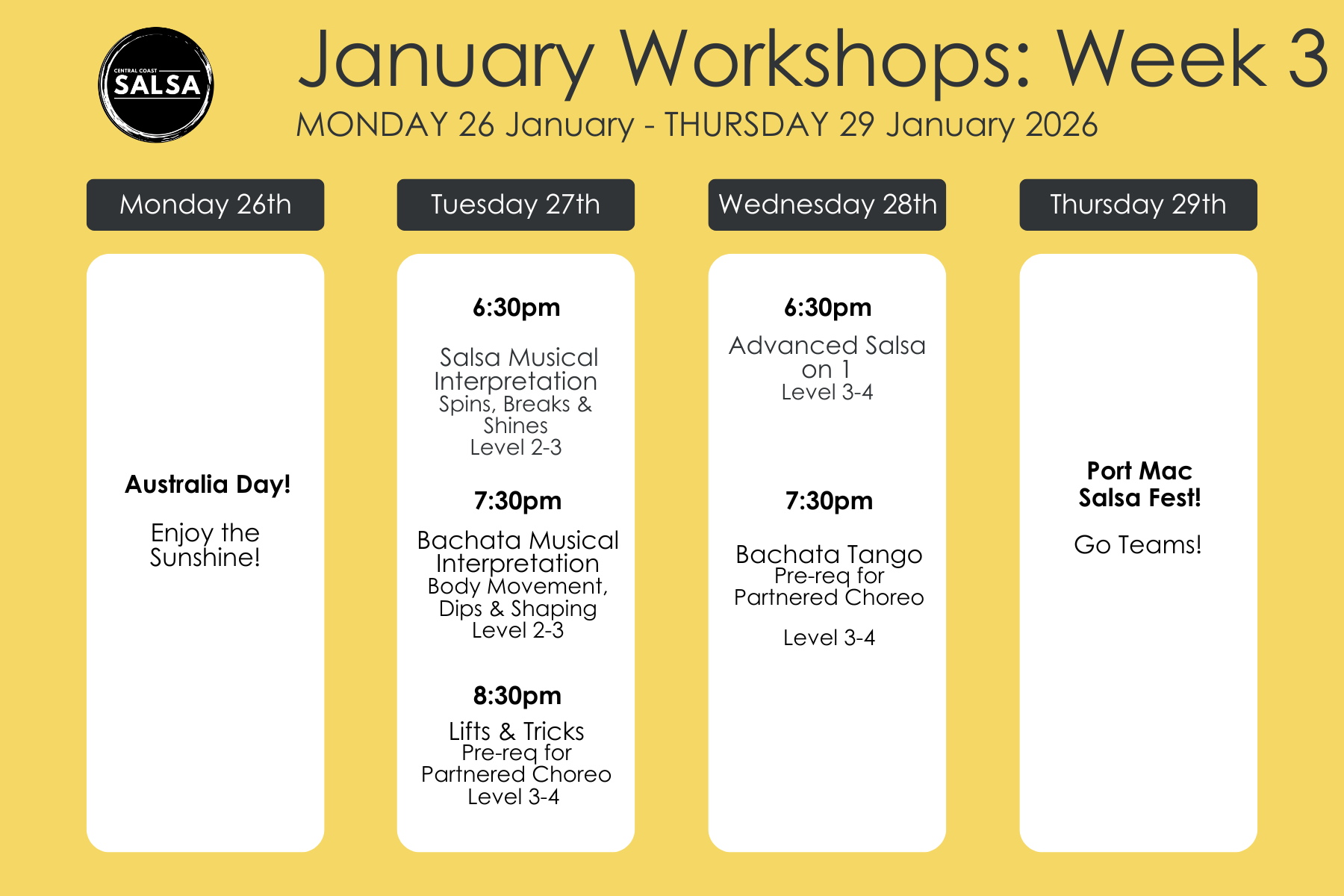 Join us for our 3-week January workshop series! With a range of workshops, bootcamps and masterclasses, we are taking a deep-dive to take your dancing to the next level!